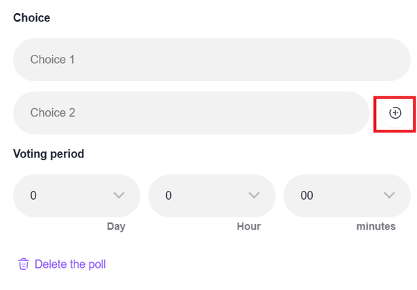 You can add more answer fields by clicking the “+” icon. You can set the duration of the poll by setting the [Days], [Hours], and [Minutes].