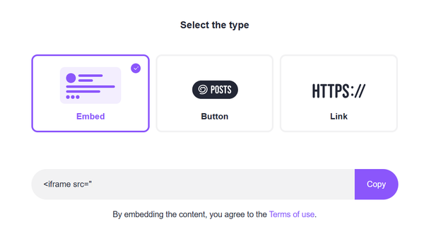 2. Select the embed method between Embed / Button / Link.
