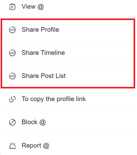 1.Select the timeline you want to embed. You can select between “Share Profile,” “Share Timeline,” or “Share Post List” from the three-dot icon.