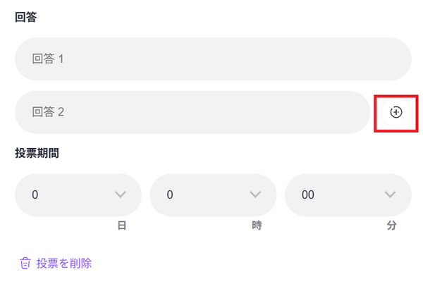 3.投票の1番目の回答を [回答1] ボックスに入力し、2番目の回答を [回答2] ボックスに入力します。+をクリックすると、回答ボックスを追加することができます。