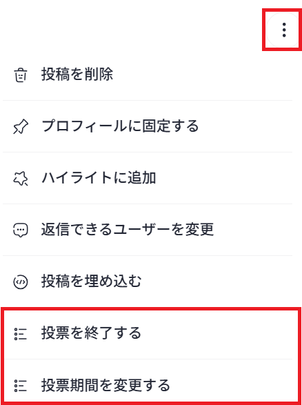 投票期間中に3点アイコンをクリックすると、投票の終了と期間の変更をすることができます。